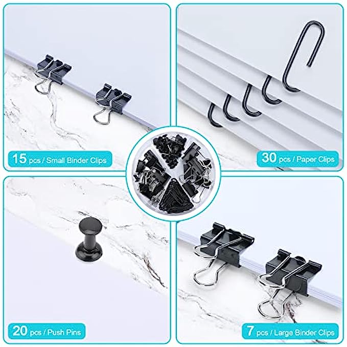 • 【Powerful storage function】Good size: ( 10.2 x 5.7 x6.2 inches) More storage space for office supplies, This black desk organizers with 7 compartments(5 parts + 2 sliding drawer), and 72 desk Accessories (7pcs large binder clips + 15pcs small binder clips + 20pcs push pins + 30pcs paper clips) for sorting and storage.