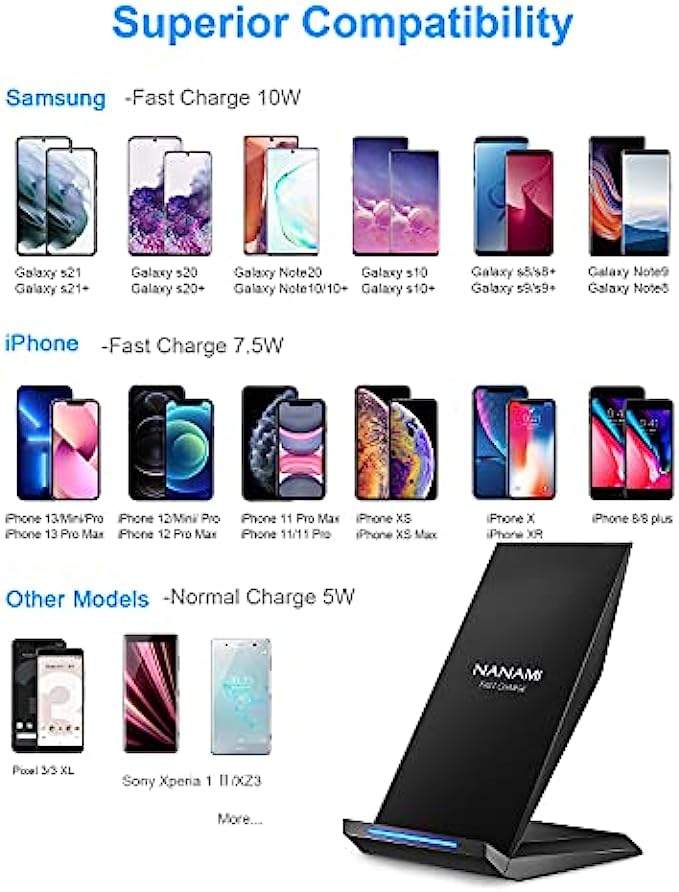 TWO WIRELESS CHARGING MODES- 10W Fast Charge Model: Galaxy S22/S21/S20/S20+/S20 Ultra/S10/S10+/S10E/S9/S9+/S8/S8+/S7 and Note 20/20 Ultra/10/10+/9/8/5, required QC 2.0 or above adapter as its power source(Not Included); 7.5W Fast Charge Model: iPhone 13/13 mini/13 Pro/13 Pro Max/12/12 Pro/12 Pro Max/11/11 Pro/11 Pro Max/XS/XS Max/XR/X/8/8 Plus; 5W Standard Charge Model: Standard QI enabled devices like Pixel 3/3XL,Samsung S6/S6Edge; Some device may require the additional Qi wireless receiver.