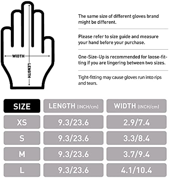 • PROPER SIZE MATTERS - Vinyl disposable gloves are less form-fitting and elastic than latex or nitrile gloves, but more economical. Please refer to the size chart to find your own size. One-Size-Up is recommended if you are lingering between two sizes. Tight-fitting may cause gloves run into rips and tears.