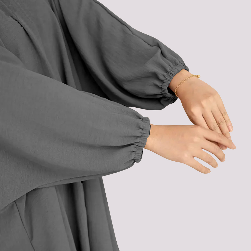 Material Quality:crinkle Colour:very nice light blue color Very flowy. Batwing. Modest